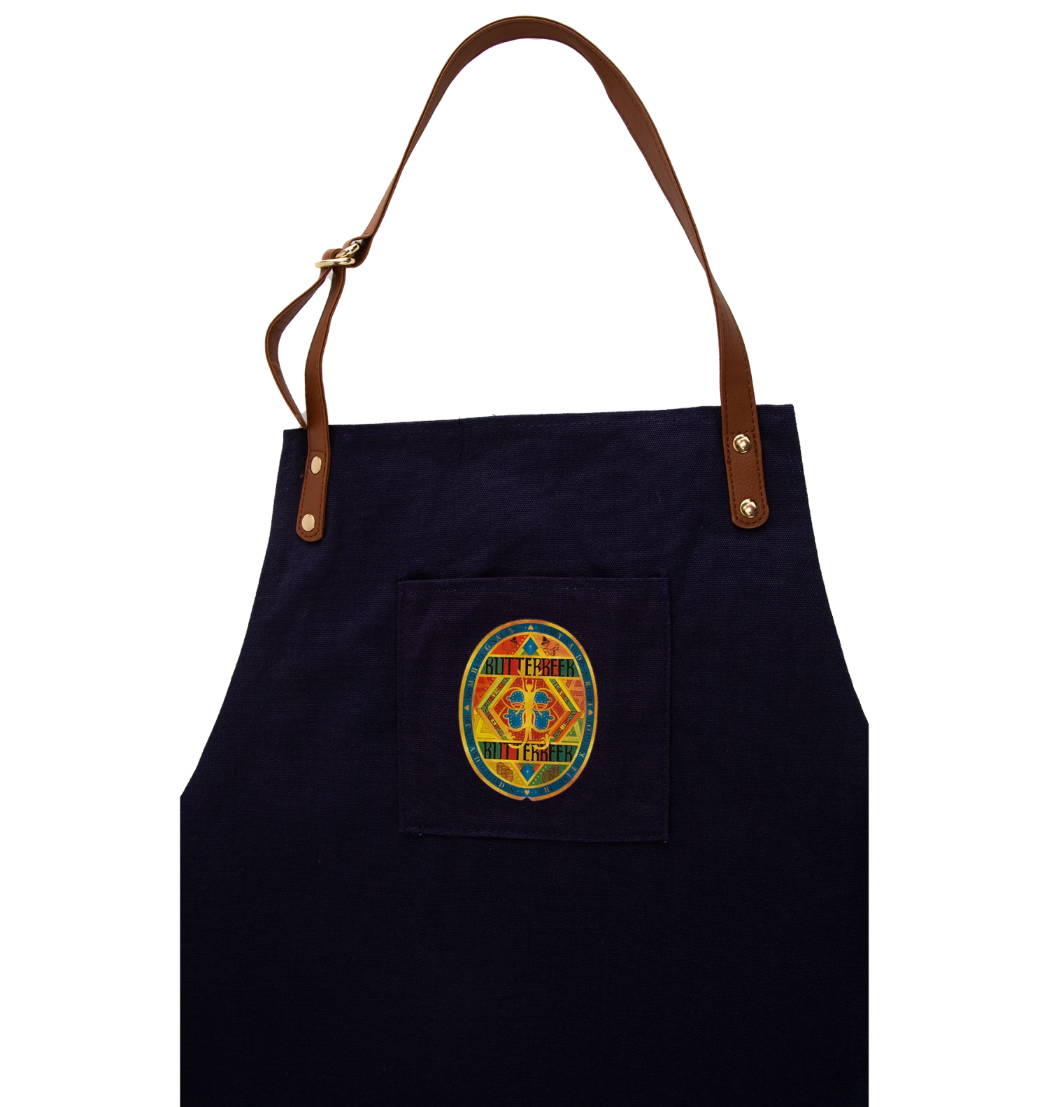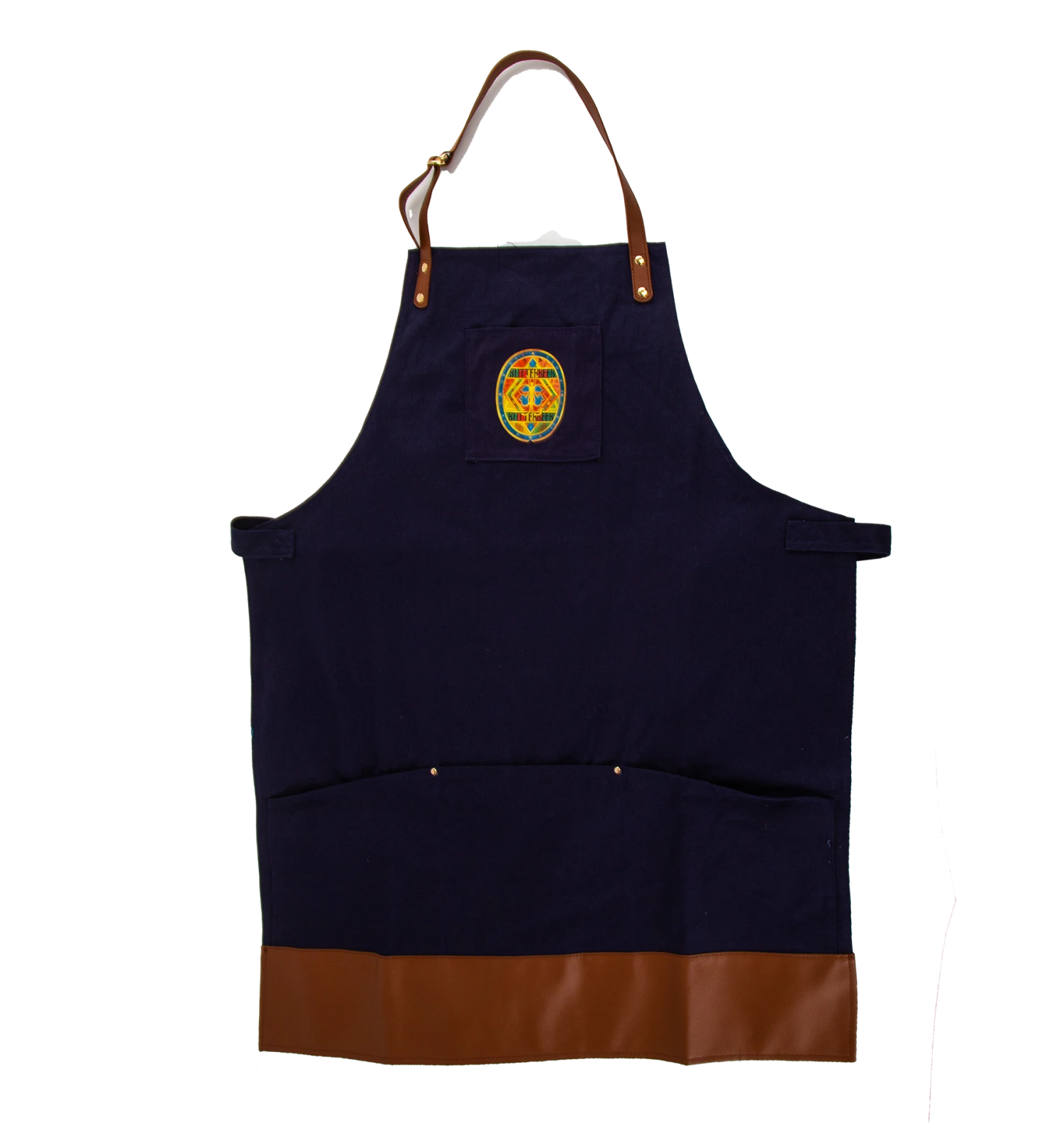 Available in a navy-blue denim-like design, the apron has an adjustable neck strap and large utensil pocket to line the bottom, accented in a soft brown vinyl material and gold colour hardware.