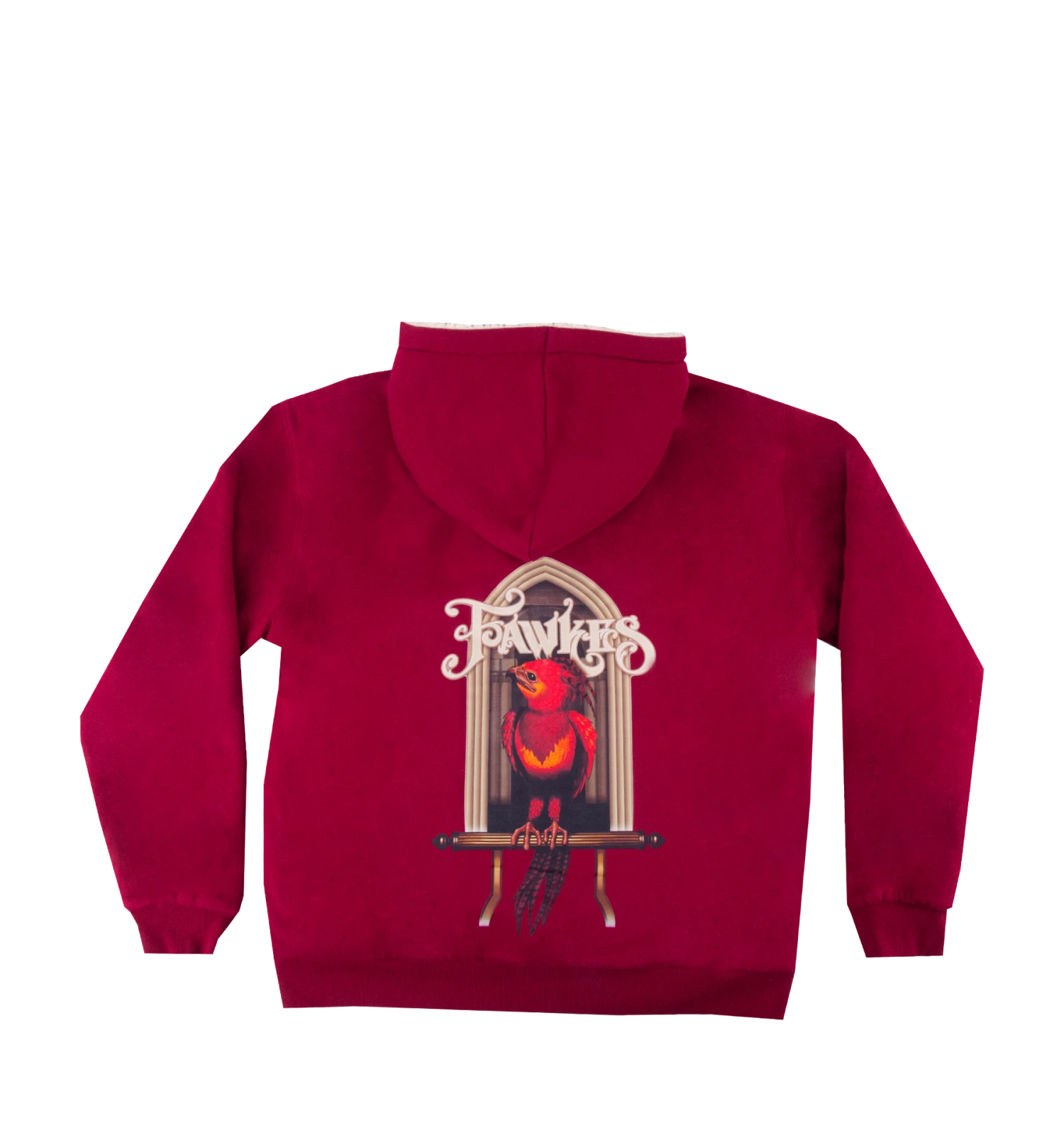 On the back, an adorable Fawkes looks up from under a gothic arch in Dumbledore’s office, where his name features prominently in a flowing cursive style font. The ‘Fawkes’ name can also be seen embroidered on the left chest along with two white feathers. Generously sized dual pockets travel down to the bottom hem, while brass colored hardware accents both drawstrings and the zip at center front. A decorative tape at the back of the neck reads “Fascinating creatures, phoenixes.”