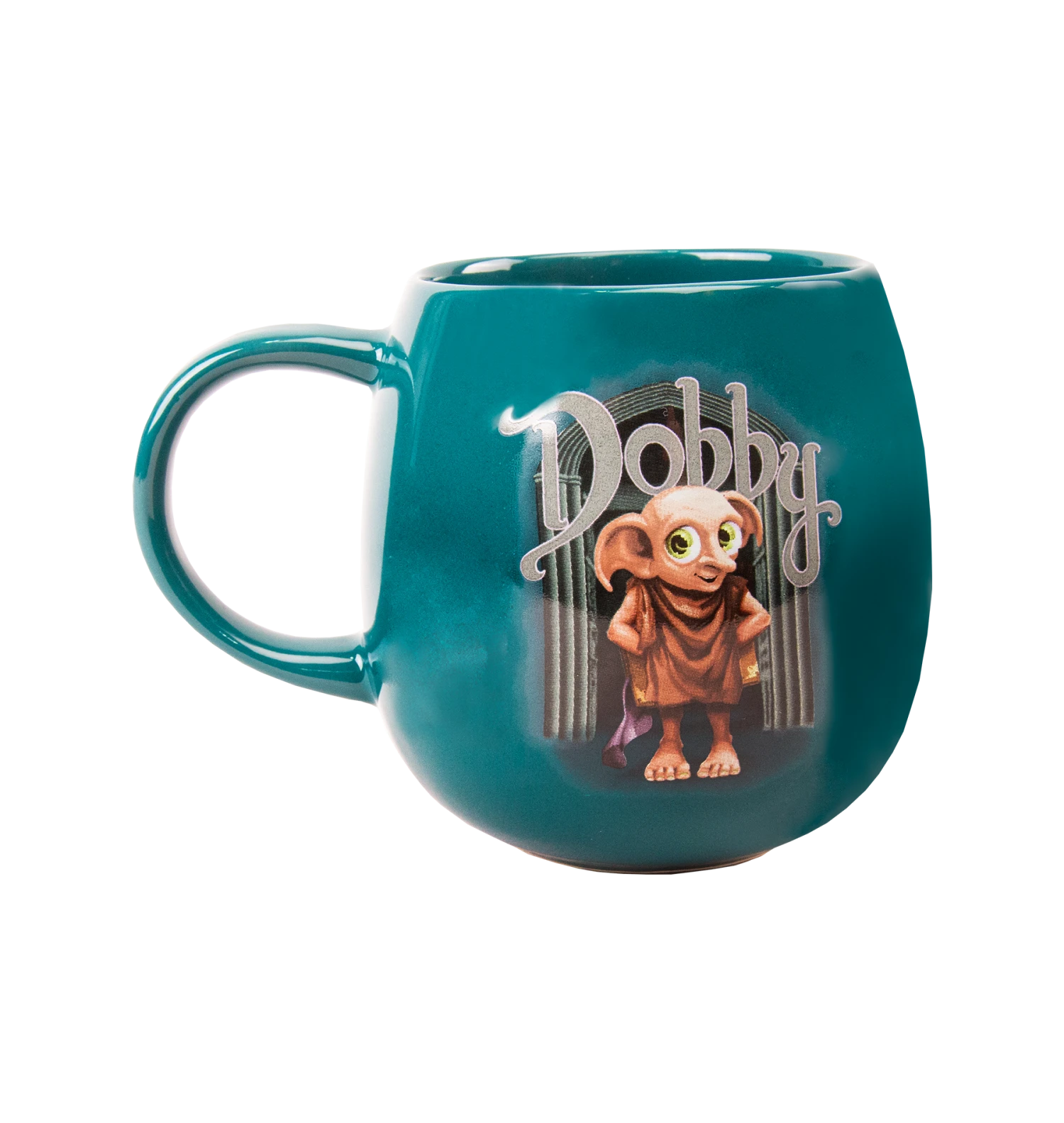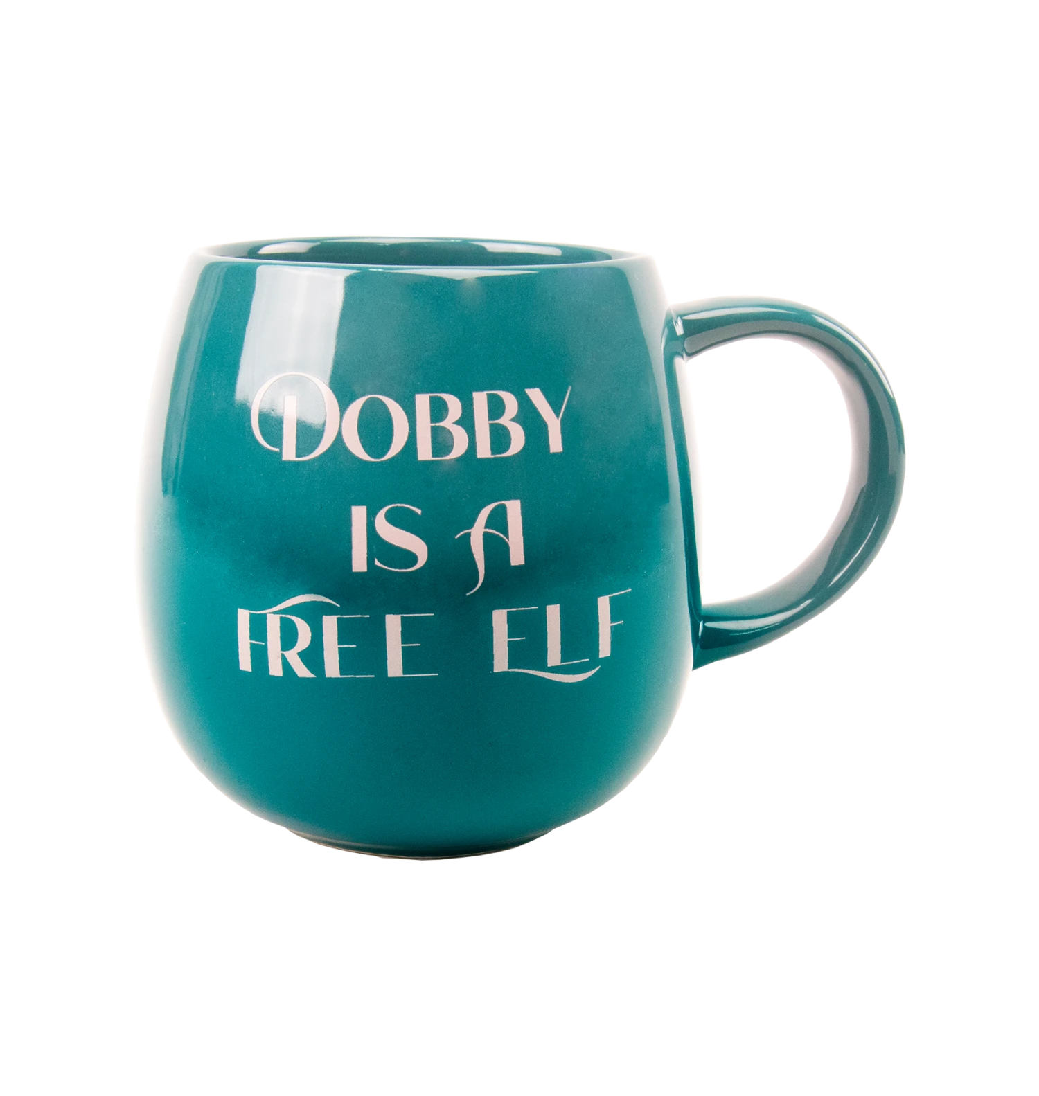 This emerald green Dobby mug features the collection’s signature exclusive artwork of a cute but coy Dobby printed on the front. He carries a sock, Tom Riddle’s Diary and a smile while positioned under prominent scrolling font of his name. Dobby’s famous quote “Dobby is a Free Elf” is written on the back side in mint green writing.