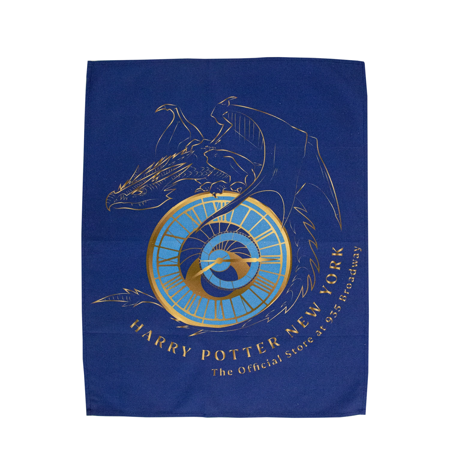 This iconic steel blue tea towel features a graphic illustration of the Hungarian Horntail dragon sitting on top of a clock. This image is reminiscent of the clock statue seen on the outside facade of the Harry Potter New York store at 935 Broadway. The tea towel features a unique design to its location with the name and address of Harry Potter New York wrapping around the bottom of the artwork.