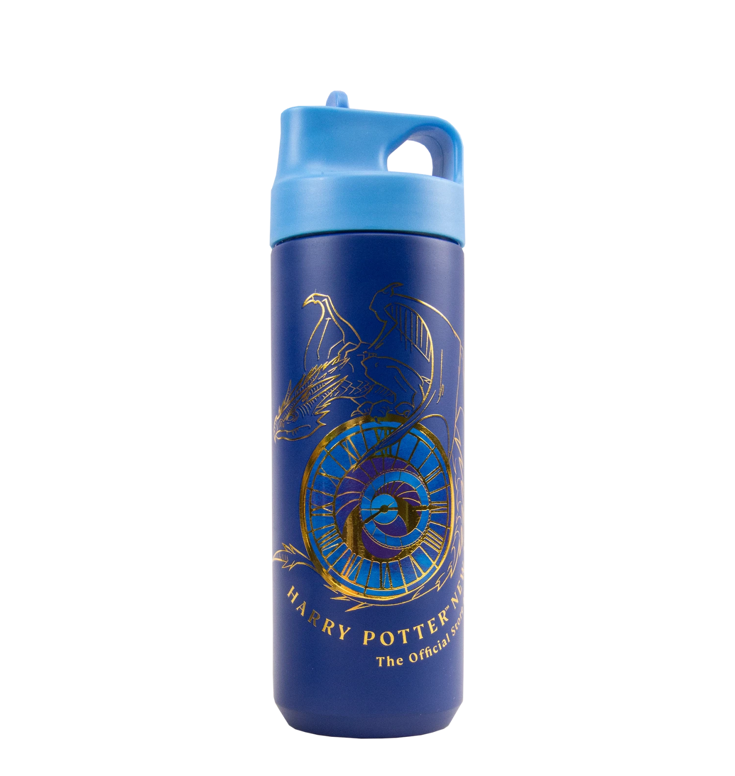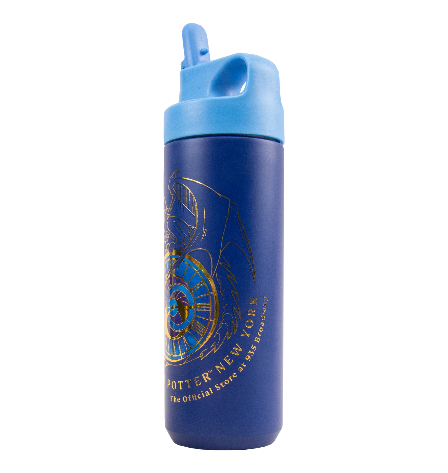 This iconic steel blue water bottle features a graphic illustration of the Hungarian Horntail dragon sitting on top of a clock, reminiscent of the statue seen on the outside facade of the Harry Potter New York store at 935 Broadway. The water bottle features a unique design to its location with the name and address of the iconic shop wrapping around the bottom of the artwork in a gold reflective print.