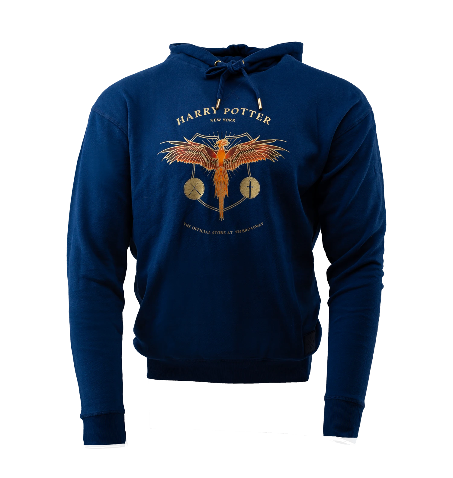 This relaxed deep blue hoodie is exclusive to Harry Potter New York and features a striking graphic illustration of Fawkes the phoenix on the center chest.