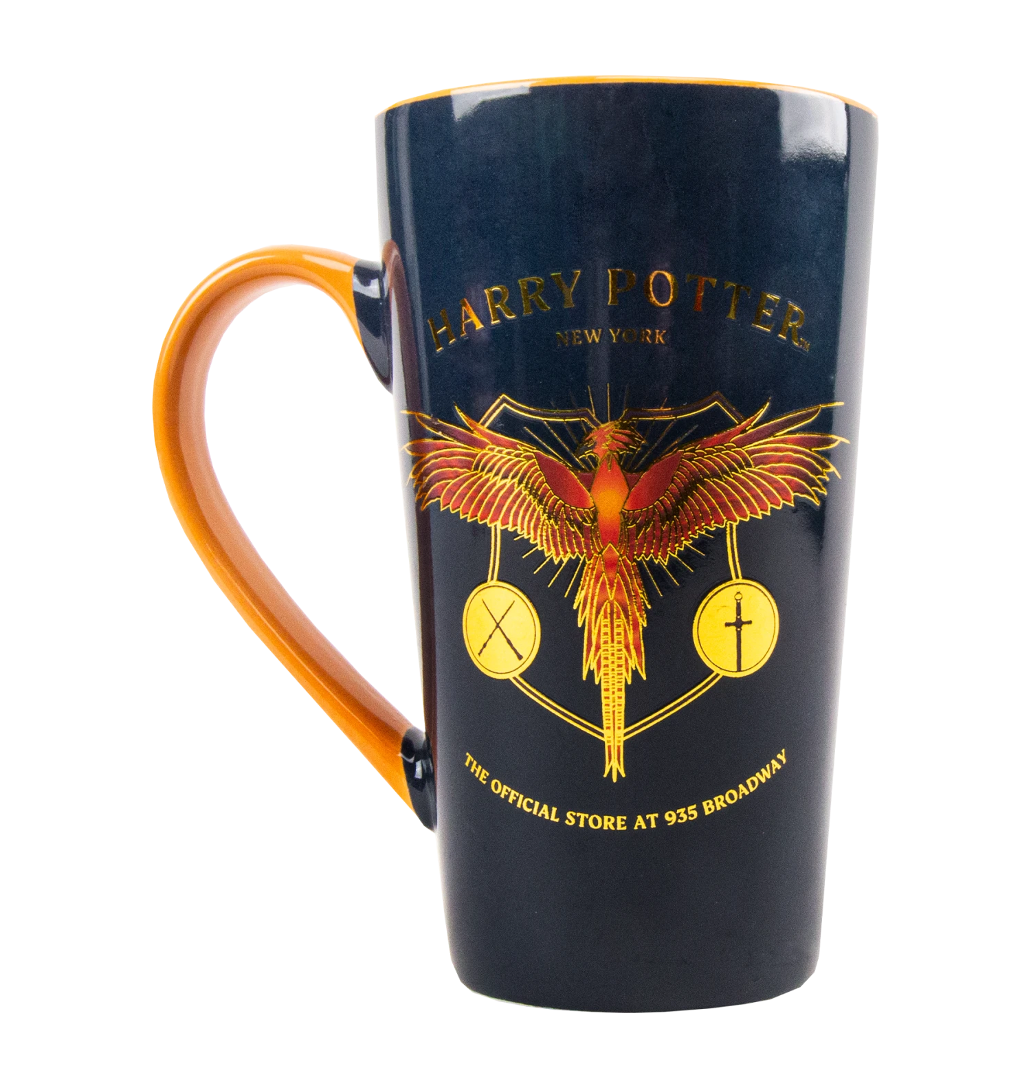 Exclusive to the Harry Potter New York shop, this designer mug will add a hint of magic to any witches’ or wizards’ kitchen! In deep navy and gold colors, a striking embossed graphic of a fire red Fawkes the phoenix flies prominent in the center with wings outstretched. Store branding reads “Harry Potter New York” overhead, and “The Official Store at 935 Broadway” along the bottom. ‘NEW YORK’ can be seen on the back in an impressive reflective gold font. The inside of the mug and handle add an elegant touch in contrasting orange.