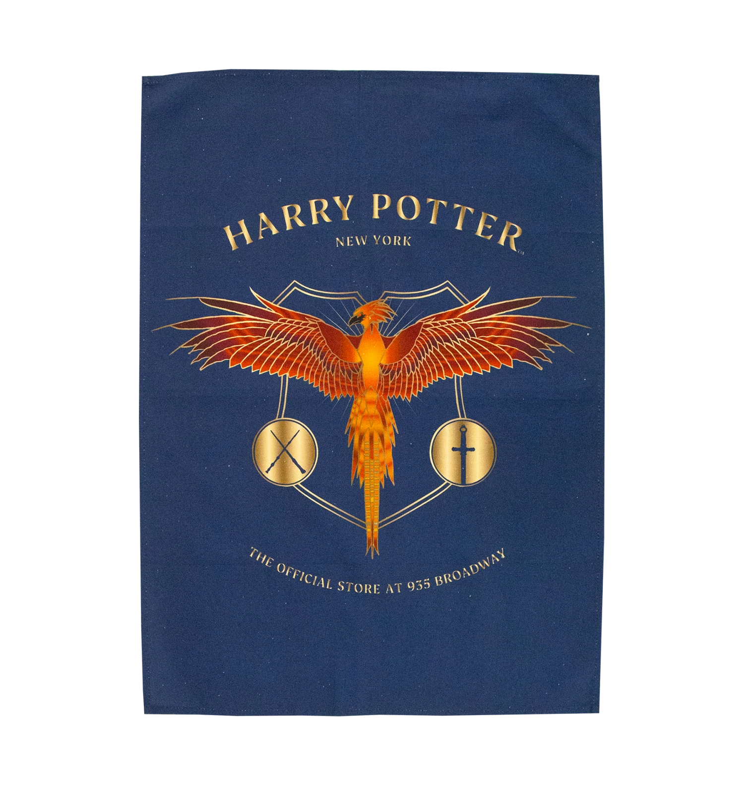 Exclusive to the Harry Potter New York shop, this designer tea towel will add a hint of magic to any witches’ or wizards’ kitchen! In deep navy and gold colors, a striking embossed graphic of a fire red Fawkes the phoenix flies prominent in the center with wings outstretched. Store branding reads “Harry Potter New York” overhead, and “The Official Store at 935 Broadway” along the bottom.