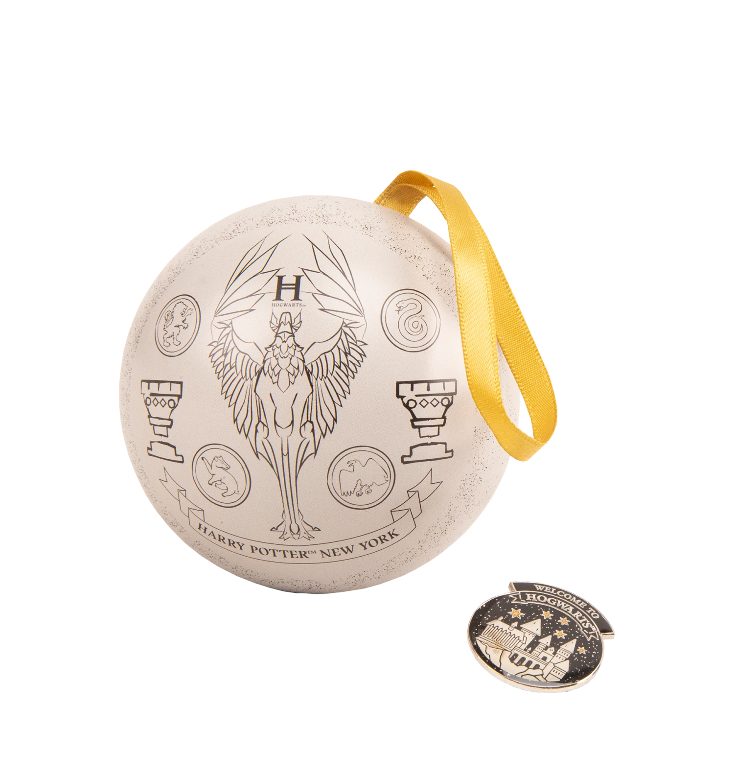 This iconic pearl white Christmas decoration features artwork of the griffin to guard the stairway to Dumbledore’s office. Icons representing the four Hogwarts houses line the top of the graphic, along with an ‘H’ for Hogwarts. The bauble ornament possesses unique branding to the location including the name and address of the iconic store, reading “Harry Potter New York” and “The Official Store at 935 Broadway”.