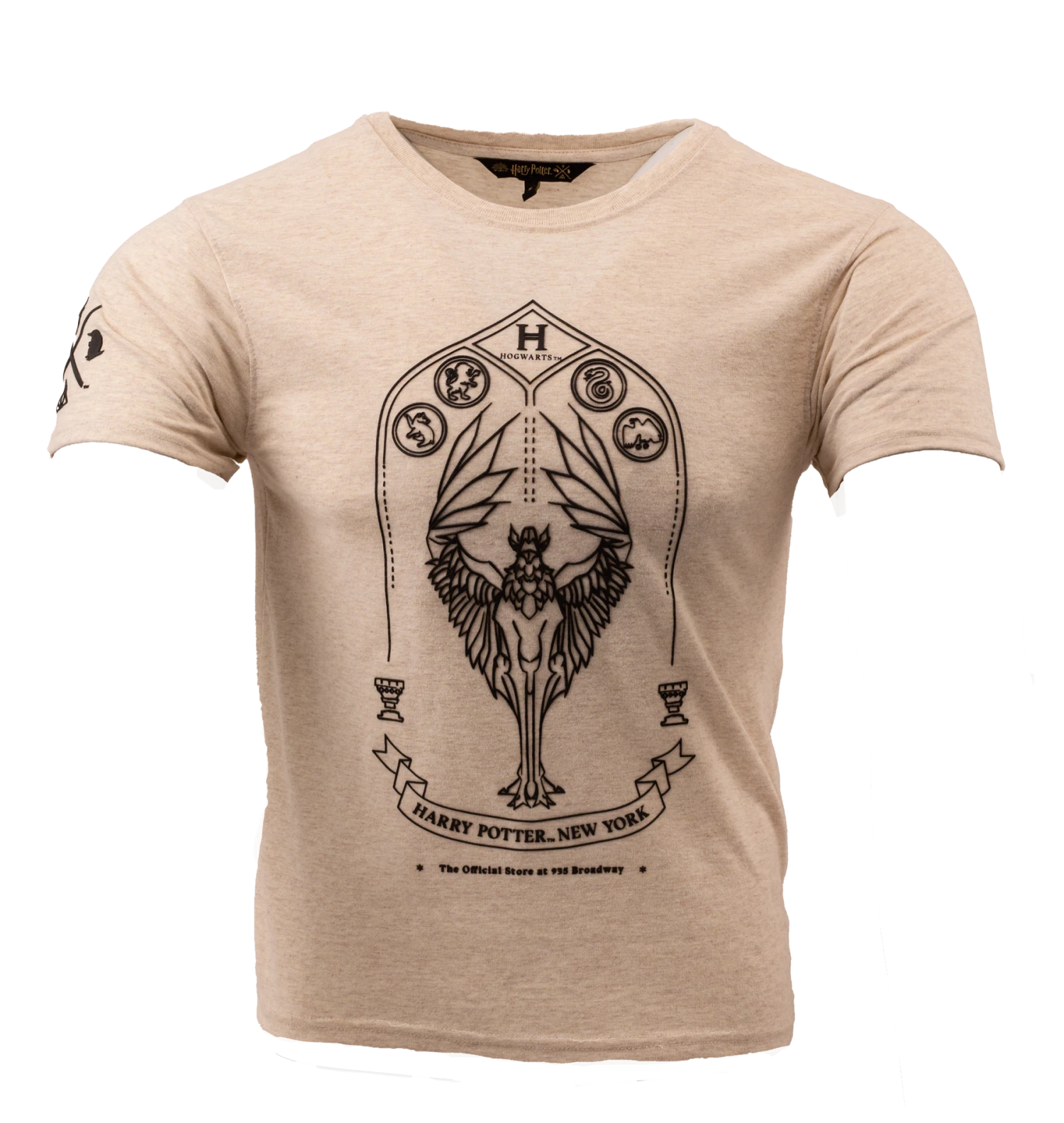 This relaxed light gray ringer t-shirt is exclusive to Harry Potter New York and features graphic artwork of the griffin to guard the stairway to Dumbledore’s office. Icons representing the four Hogwarts houses line the top of the illustration, along with an ‘H’ for Hogwarts.