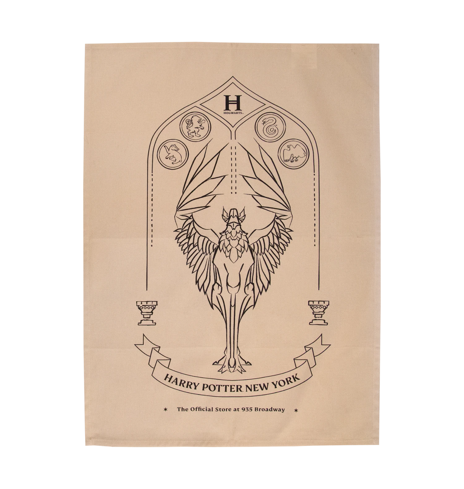 This cream color tea towel is exclusive to Harry Potter New York and features graphic artwork of the griffin to guard the stairway to Dumbledore’s office. Icons representing the four Hogwarts houses line the top of the illustration, along with an ‘H’ for Hogwarts. The towel possesses unique branding to the location including the name and address of the iconic shop, reading “Harry Potter New York” and “The Official Store at 935 Broadway”.