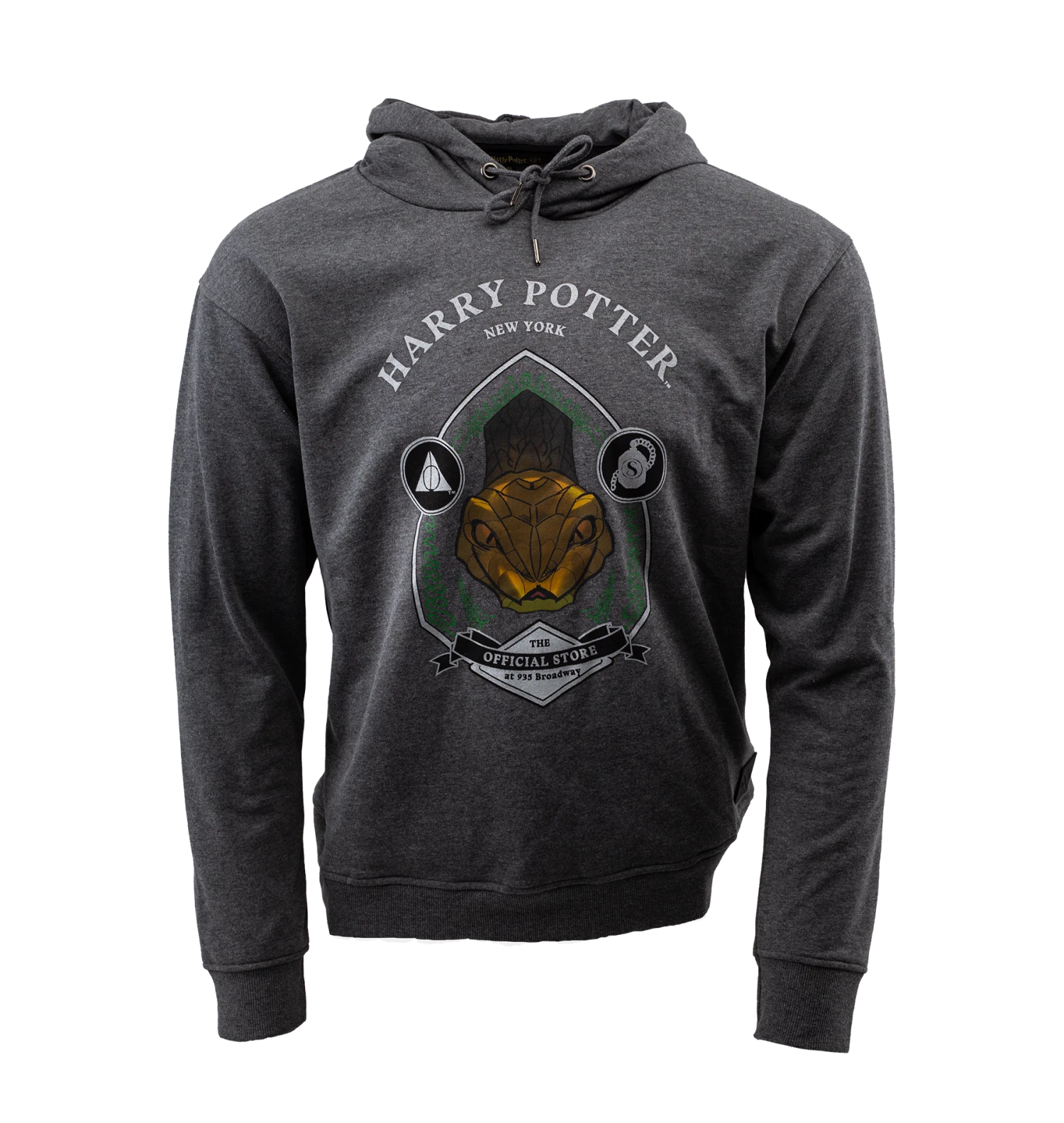This relaxed dark gray hoodie is exclusive to Harry Potter New York and features a large color illustration of Nagini the snake at the center chest. The unique graphic includes surrounding icons of the Deathly Hallows and the Slytherin horcrux locket.