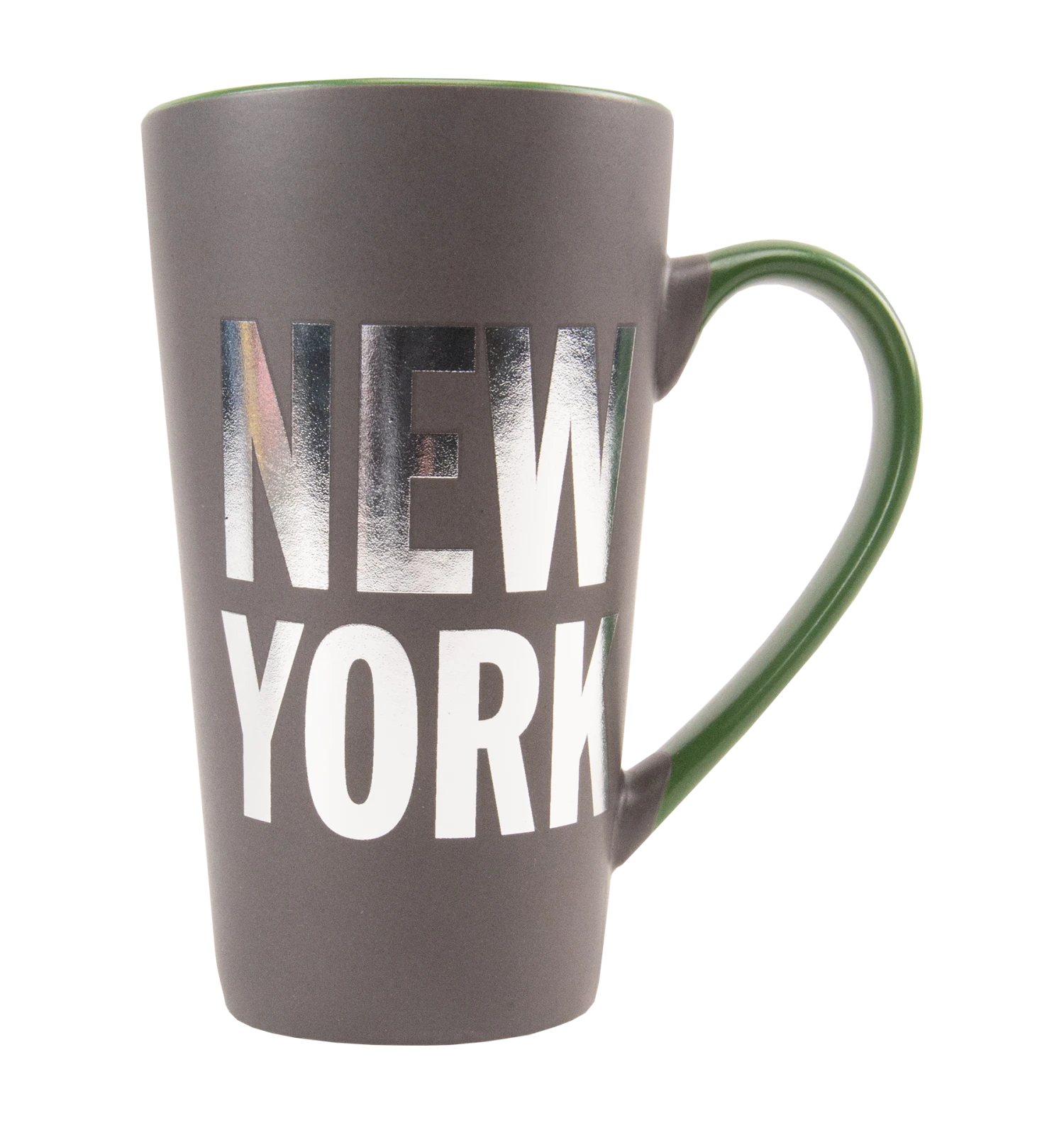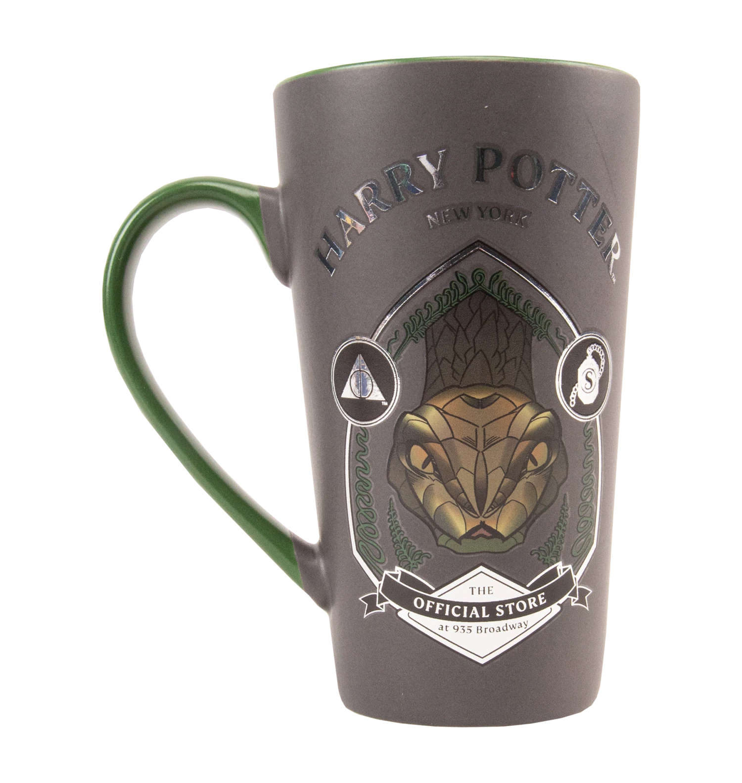 Fans of the darker side of Harry Potter will appreciate this satin grey Nagini mug. Exclusive to Harry Potter New York and featuring a large color illustration of the infamous snake at the center, the unique graphic includes surrounding icons of the Deathly Hallows and the Slytherin horcrux locket. It also possesses exclusive branding to the location including the name and address of the iconic shop, reading “Harry Potter New York” and “The Official Store at 935 Broadway”. ‘NEW YORK’ can be seen on the back in an impressive reflective silver font. The inside of the mug and handle add an elegant touch in contrasting olive green.