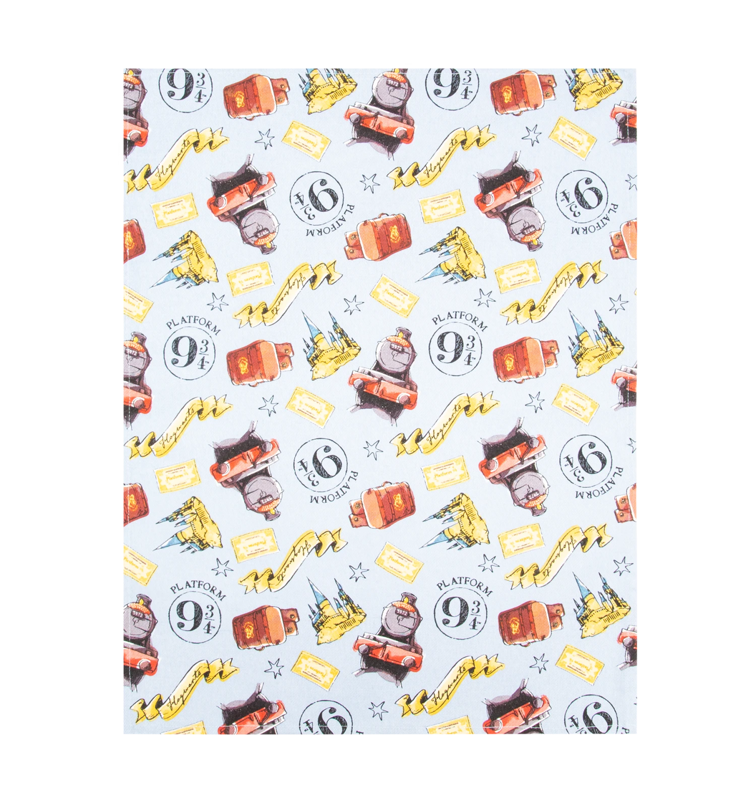 The set includes three distinct designs. The first towel showcases a large illustration of the iconic Hogwarts Express, capturing the essence of the iconic steam engine. The second towel features a whimsical Hogwarts Express ticket design, while the third is covered in all-over print, showcasing the magical elements associated with the iconic platform on a delightful baby blue backdrop.