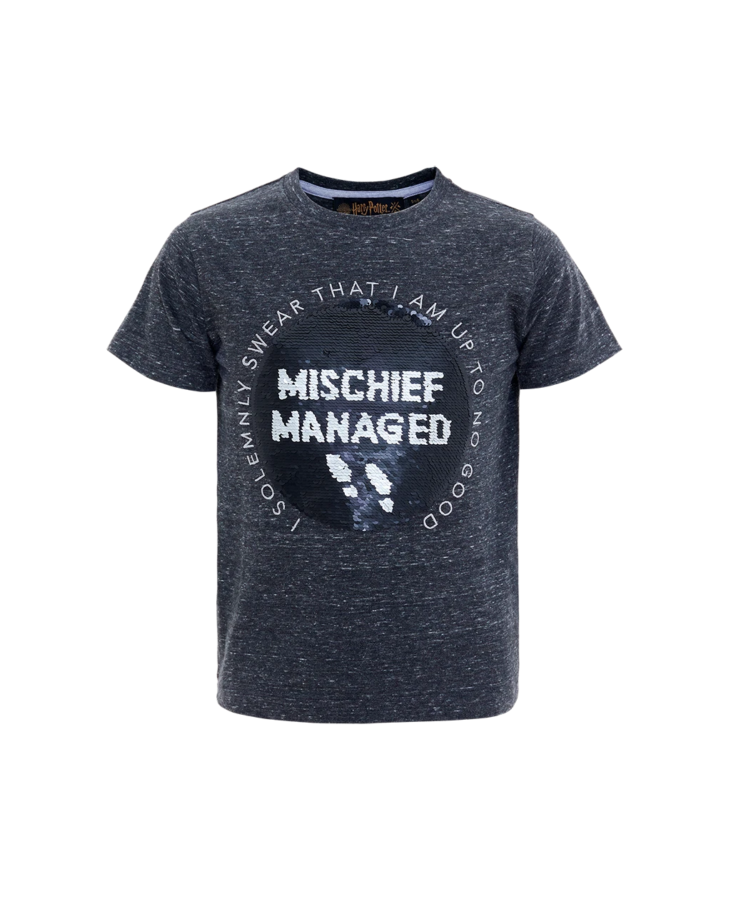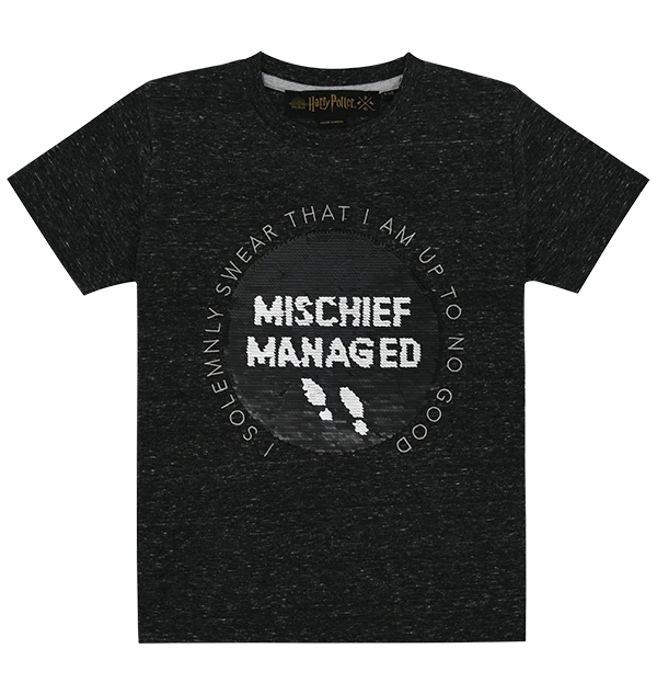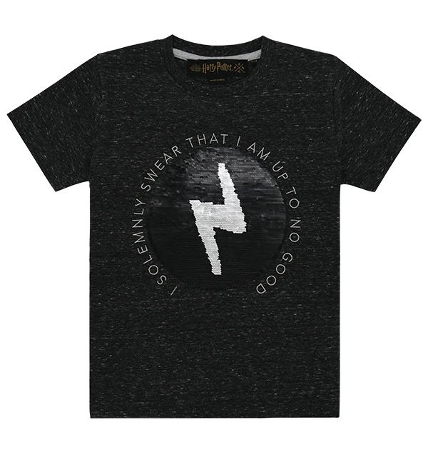 Unleash some magical mischief with this captivating Marauder’s Map kids t-shirt. This enchanting gray shirt showcases a mesmerizing black and silver sequin Mischief Managed logo on the front, ready to astonish. Brush the sequins upward to reveal a hidden lightning bolt image! Completing the spellbinding design, circular embroidered text reads ‘I solemnly swear that I am up to no good,’ capturing the spirit of the Marauder’s Map.