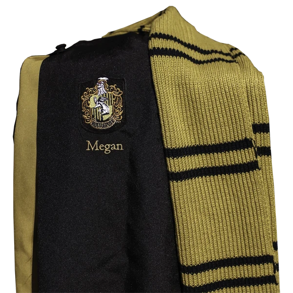 Celebrate your Hogwarts house pride with this replica Hufflepuff robe, as seen in the Harry Potter film series. The Hufflepuff robe features contrasting yellow lining, pockets (there’s even a hidden pocket for your wand!), and embroidered Hufflepuff crest. 100% polyester.