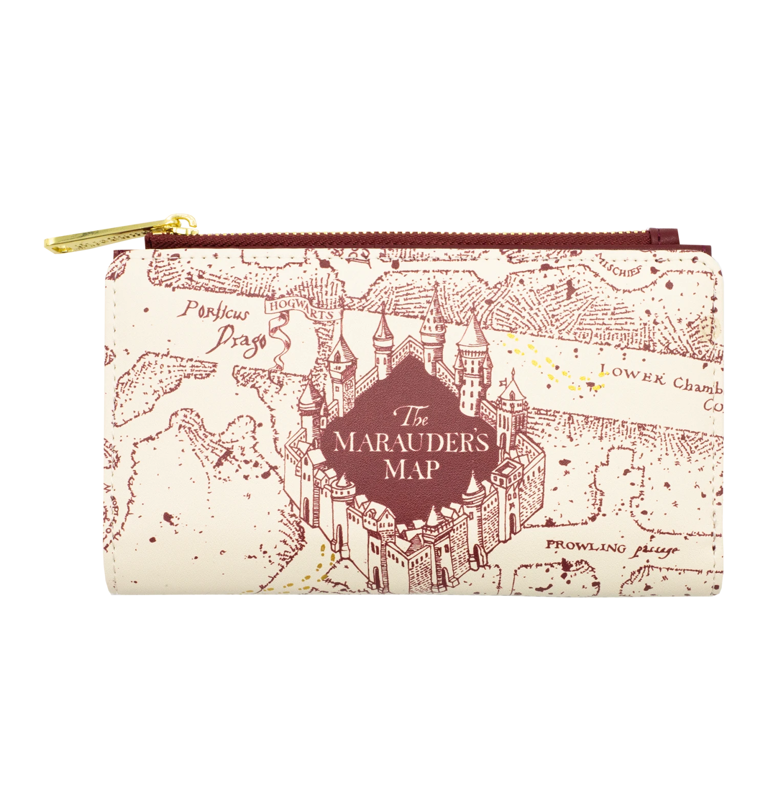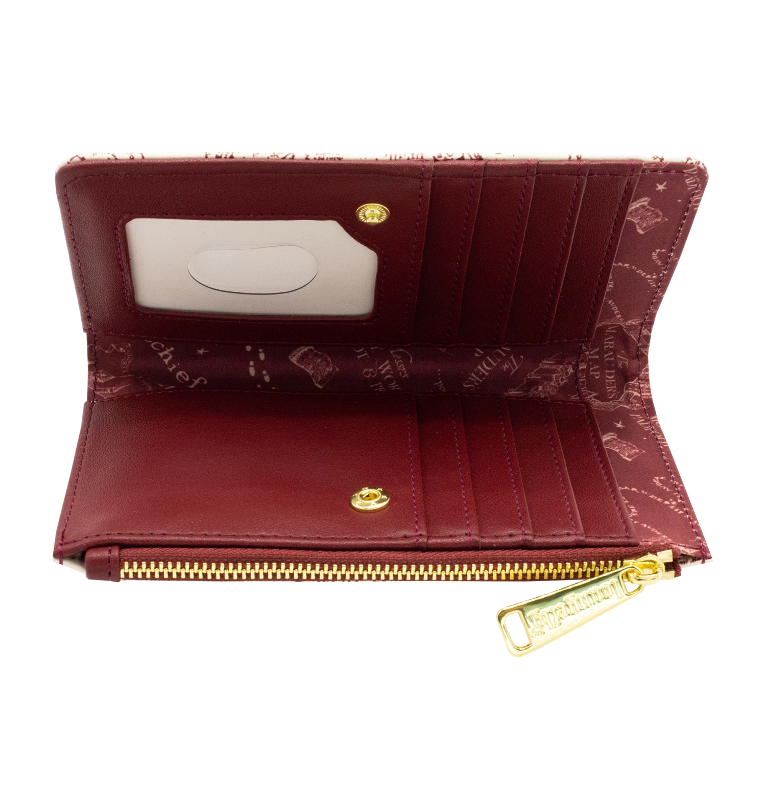 Crafted from burgundy and cream PU, the outside of the wallet features a bold statement print of the infamous Marauder’s Map. The inside is lined in a solid burgundy PU highlighted by an additional white and burgundy all-over map print. With eight interior card pockets, a place to hold larger bills, and an inner gold snap closure, you can keep your valuables organized and secure. The wallet also boasts a large Harry Potter x Loungefly branded plaque on the back, ensuring its authenticity. Close the wallet shut with the gold hardware zipper and let the mischief begin!