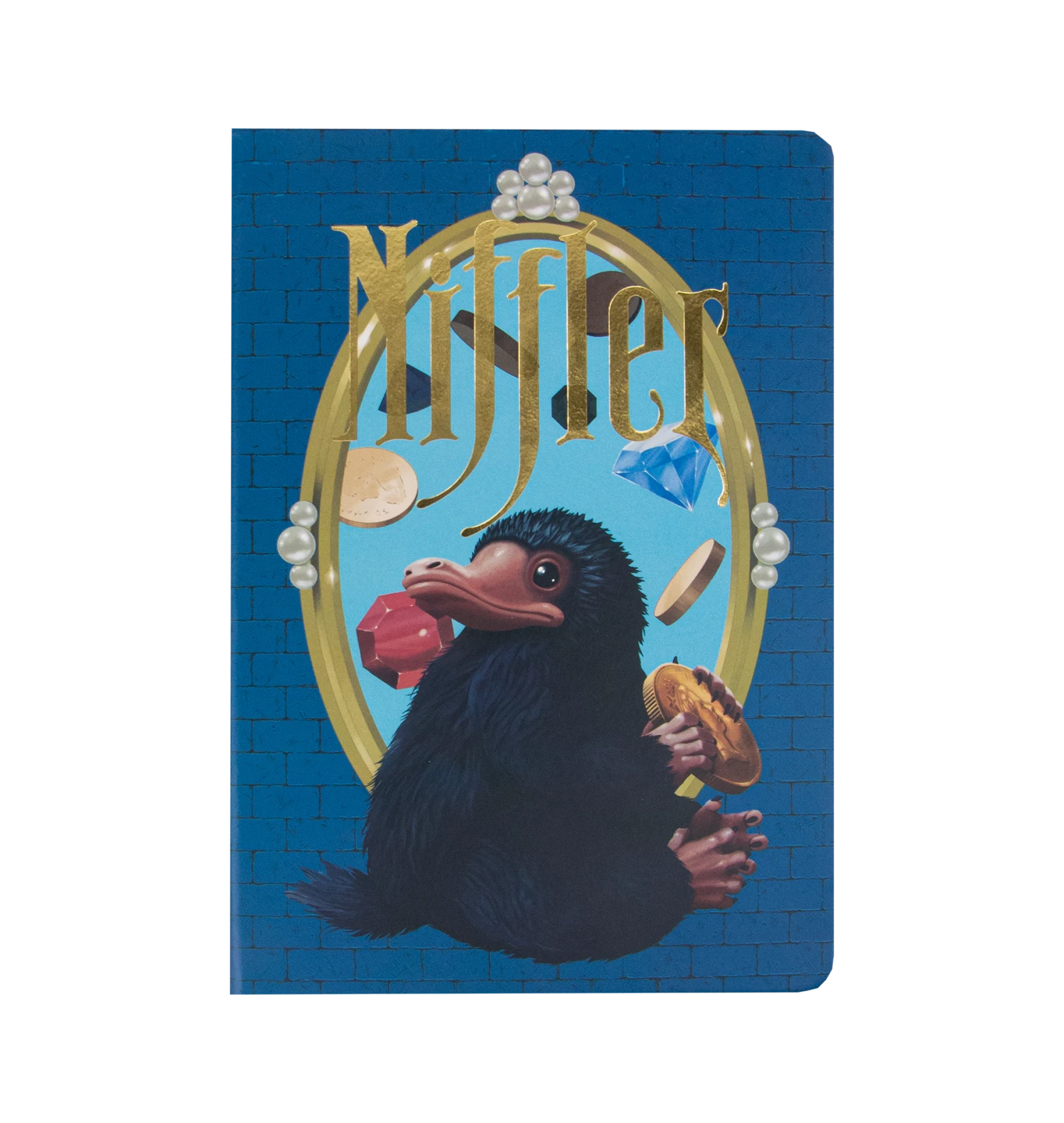 This exclusive cerulean color notebook features the collection’s signature artwork of a cute and mischievous looking Niffler on the front cover. Prominent gold foil font of his name is positioned over his head. Open to the first page and be greeted by all an over print of rubies, diamonds and coins, with Newt Scamander’s quote “Anything shiny, he’s all over the place” at the center. Each of the individual ruled pages are watermarked with a small print of more treasures present in the bottom corners. Also includes gold metallic highlighting on the edges and a gold ribbon to mark your place!