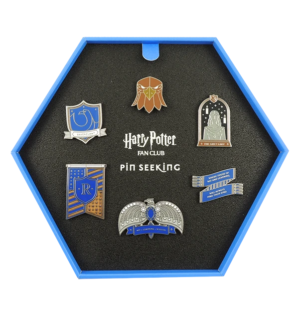 Start your Harry Potter Fan Club Pin Seeking collection with this Ravenclaw house pin set. This 6-pin set includes the Ravenclaw house crest, a glow-in-the-dark Grey Lady, Ravenclaw house banner, the Ravenclaw Diadem, Ravenclaw scarf, and an exclusive pin available only when you purchase this set – the Ravenclaw eagle!